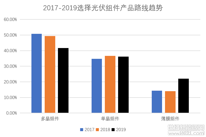2019年選擇多晶組件產品的意愿持續降低,與單晶產品基本持平。同時,選擇薄膜太陽能產品的意愿回升,同比上年+8%。