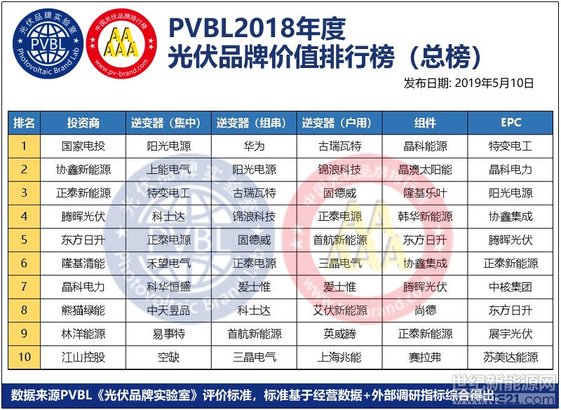 2019年1月25日至4月10日,光伏品牌實驗室(PVBL)、世紀新能源網(Century New Energy Network)聯合開展2018年度《PVBL中國光伏品牌及趨勢》數據調研及趨勢分析工作,意在評估2018年度中國及全球光伏產業鏈各企業的品牌價值與市場環境,為未來新能源產業發展提供量化、權威及可靠依據。